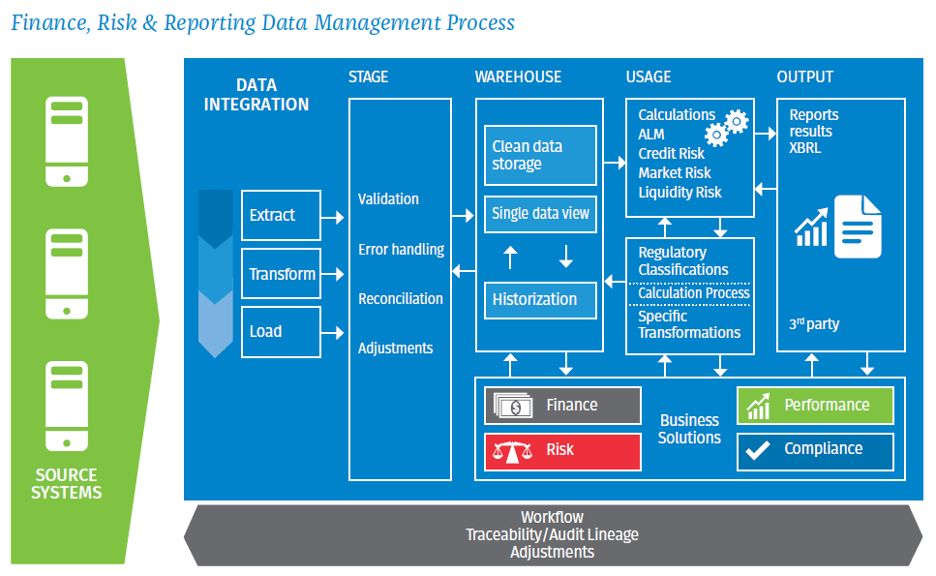 It includes a rich, robust, business-focused data model, allowing different departments to store granular business information with meaningful results specific to the unit. It provides a single, integrated data repository for multiple use-cases across Finance and Risk, as well as other functions.